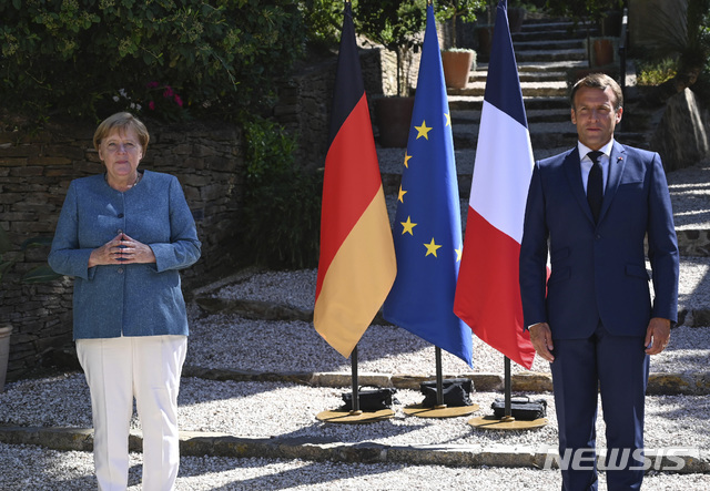 [브레강송요새=AP/뉴시스]앙겔라 메르켈 독일 총리(왼쪽)와 에마뉘엘 마크롱 프랑스 대통령이 20일(현지시간) 프랑스 남부 브레강송요새에서 정상회담을 시작하기 전 기념촬영을 하고 있다. 2020.8.21.