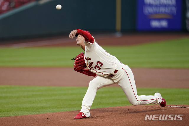[세인트루이스=AP/뉴시스]세인트루이스 카디널스의 김광현이 22일(현지시간) 미 미주리주 세인트루이스의 부시 스타디움에서 열린 2020 메이저리그(MLB) 신시내티 레즈와의 홈 경기에 선발 등판해 1회 투구하고 있다. 2020.08.23.