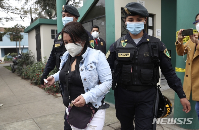 [리마=AP/뉴시스]23일(현지시간) 페루 경찰이 리마의 나이트클럽에서 체포한 한 여성을 연행하고 있다. 앞선 22일 밤 나이트클럽에 모여 놀던 사람들이 경찰 급습 소식에 서로 먼저 빠져나가려다 압사하는 등 13명이 사망했다. 페루는 코로나19 확산 방지를 위해 지난 3월부터 술집, 나이트클럽을 폐쇄했으며 최근에는 직계 가족이 아닌 확대 가족 간의 만남도 못 하게 하고 야간 통금을 실시하고 있다. 2020.08.24.