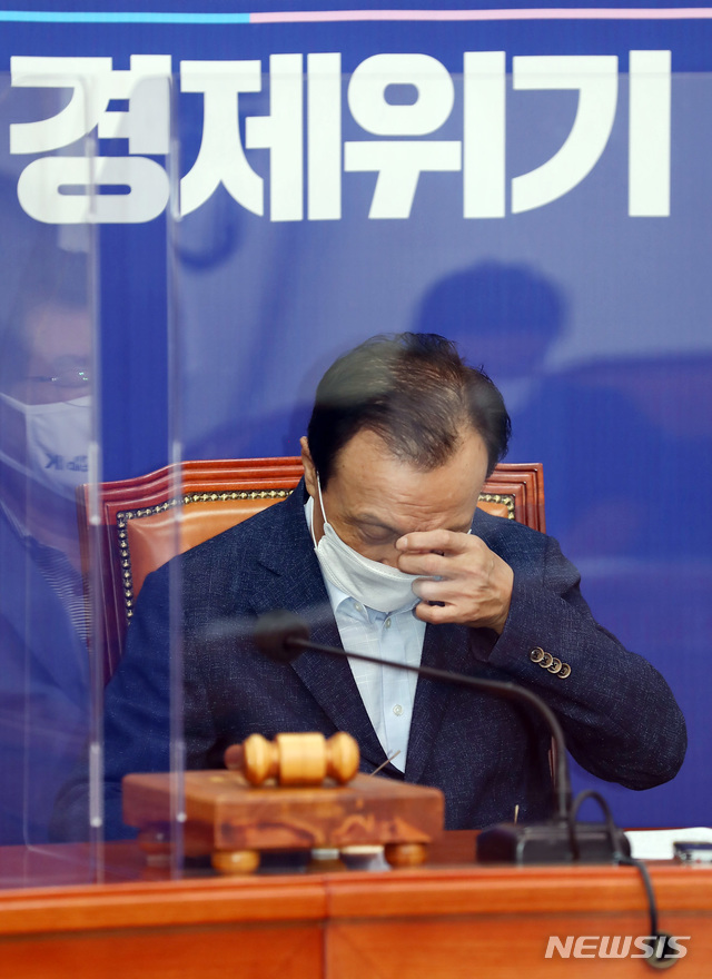[서울=뉴시스]김진아 기자 = 이해찬 더불어민주당 대표가 24일 서울 여의도 국회에서 열린 더불어민주당 최고위원회의에 참석해 눈을 비비고 있다. 2020.08.24.