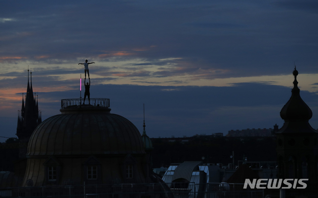 [프라하=AP/뉴시스]25일(현지시간) 체코 프라하의 몇몇 옥상에서 곡예사와 배우들이 덴마크 작가 한스 크리스티안 안데르센의 '양치기와 굴뚝 청소부'를 공연하고 있다. 2020.08.26.