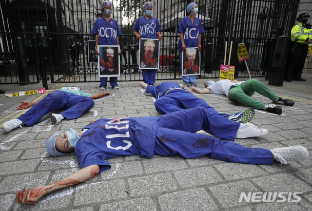 [런던=AP/뉴시스]26일(현지시간) 영국 런던 전역의 병원에서 영국 국민보건서비스(NHS) 종사자들이 15% 임금 인상 요구 시위를 벌이는 가운데 다우닝가 입구에서 간호사들이 농성하고 있다. 2020.08.27.