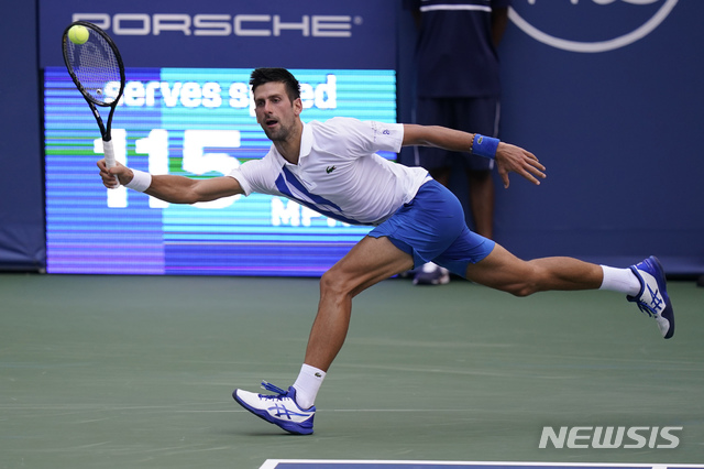 [뉴욕=AP/뉴시스]노바크 조코비치(1위·세르비아)가 28일(현지시간) 미국 뉴욕의 플러싱 메도우 루이 암스트롱 스타디움에서 열린 남자프로테니스(ATP) 투어 웨스턴&서던 오픈 준결승 로베르토 바우티스타 아굿(12위·스페인)과 경기하고 있다. 조코비치는 아굿을 세트스코어 2-1(4-6 6-4 7-6<7-0>)로 힘겹게 물리치고 결승에 올라 밀로스 라오니치(30위·캐나다)와 우승을 다툰다. 2020.08.29.