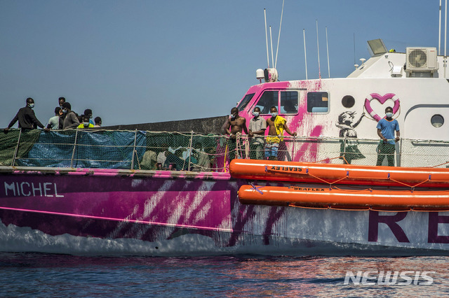 [지중해 해상=AP/뉴시스] 영국 출신의 벽화 예술가 뱅크시가 지원한 구조선인 '루이즈 미셸' 호가 지중해에서 200여 명의 난민을 구조한 뒤 조난당한 것으로 알려졌다. 29일(현지시간) 구조선 갑판에 난민들이 나와있는 모습. 2020.08.30