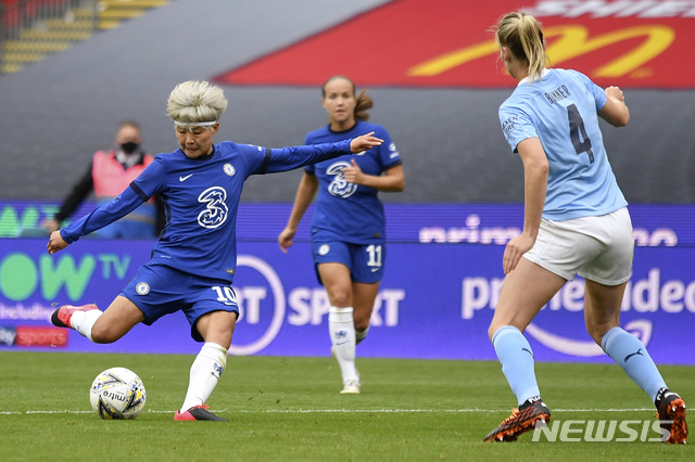 [런던=AP/뉴시스]첼시의 지소연(왼쪽)이 29일(현지시간) 영국 런던의 웸블리 스타디움에서 열린 맨체스터 시티와의 잉글랜드 FA 여자 커뮤니티 실드 경기에 선발 출전해 슛을 시도하고 있다. 지소연은 상대 퇴장을 이끌고 도움을 기록하며 팀의 2-0 우승에 이바지했으며 '플레이어 오브 더 매치'에도 선정됐다. 여자 커뮤니티 실드는 잉글랜드 여자 슈퍼리그(WSL) 우승팀과 FA컵 우승팀이 시즌 전 격돌하는 대회다. 2020.08.30.