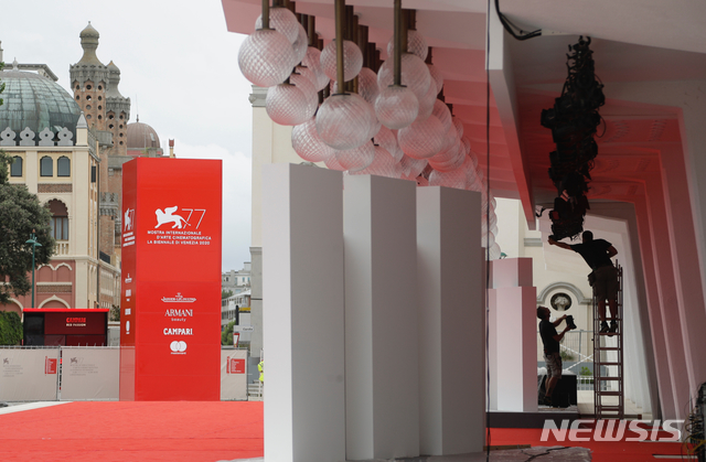 [베네치아=AP/뉴시스]지난달 31일(현지시간) 이탈리아 베네치아 리도에서 제77회 베니스 국제 영화제 개막을 앞두고 관계자들이 레드카펫에 조명을 설치하고 있다. 조직위는 2일부터 12일까지 열리는 올해 베니스 국제 영화제는 코로나19로 인해 축소 개막한다고 밝혔다. 2020.09.01.