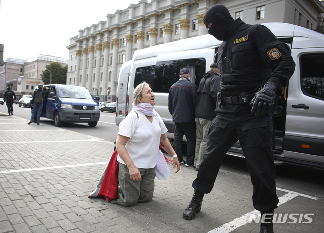 [민스크=AP/뉴시스]1일(현지시간) 벨라루스 수도 민스크에서 알렉산드르 루카셴코 대통령의 퇴진을 요구하는 반정부 시위가 열린 가운데 한 여성이 무릎을 꿇고 경찰관과 언쟁하고 있다. 에스토니아와 리투아니아, 라트비아 등 발트 3국이 루카셴코 대통령 등 30명의 벨라루스 공무원에 대해 입국 금지 제재를 발표했다. 벨라루스에 대한 제재는 발트 3국이 처음이다. 2020.09.02.
