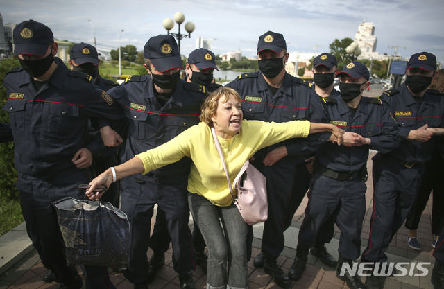 [민스크=AP/뉴시스]1일(현지시간) 벨라루스 수도 민스크에서 알렉산드르 루카셴코 대통령의 퇴진을 요구하는 반정부 시위가 열린 가운데 한 여성이 사슬을 형성한 경찰에 저항하고 있다. 에스토니아와 리투아니아, 라트비아 등 발트 3국이 루카셴코 대통령 등 30명의 벨라루스 공무원에 대해 입국 금지 제재를 발표했다. 벨라루스에 대한 제재는 발트 3국이 처음이다. 2020.09.02.