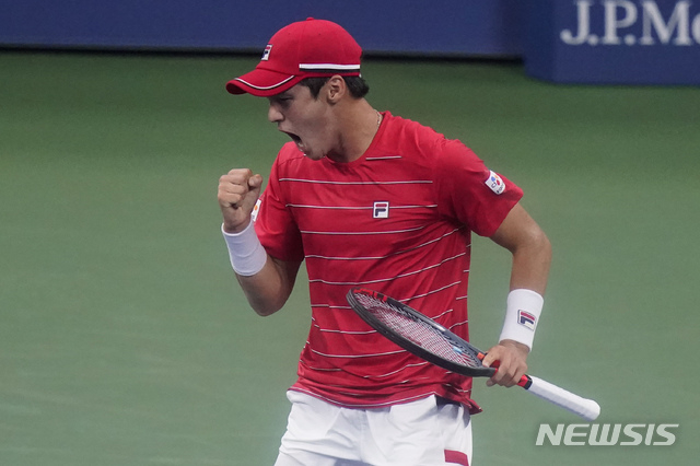 [뉴욕=AP/뉴시스]권순우(73위)가 2일(현지시간) 미국 뉴욕의 루이 암스트롱 스타디움에서 열리고 있는 US오픈 테니스 대회 남자 단식 2회전에서 데니스 샤포발로프(17위·캐나다)를 맞아 점수를 따내며 환호하고 있다. 2020.09.03.