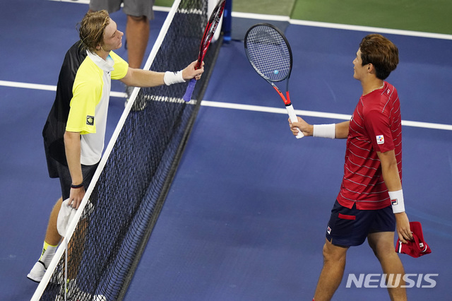 [뉴욕=AP/뉴시스]권순우(73위, 오른쪽)가 2일(현지시간) 미국 뉴욕의 루이 암스트롱 스타디움에서 열리고 있는 US오픈 테니스 대회 남자 단식 2회전에서 데니스 샤포발로프(17위·캐나다)에게 패한 후 라켓 인사를 나누고 있다. 권순우는 세트 스코어 1-3(7-6<7-5> 4-6 4-6 2-6)로 역전패 했다. 2020.09.03.