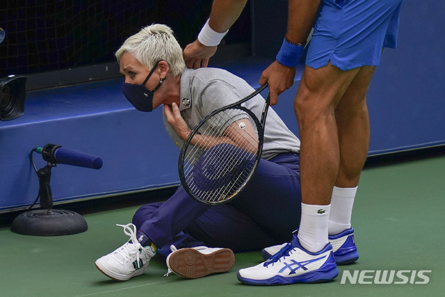 [뉴욕=AP/뉴시스]노바크 조코비치(1위·세르비아)가 6일(현지시간) 미국 뉴욕 빌리진 킹 내셔널 테니스센터에서 열린 US오픈 남자 단식 16강전 파블로 카레노 부스타(27위·스페인)와의 경기 중 홧김에 친 자신의 공에 목을 맞은 선심의 상태를 체크하고 있다. 조코비치는 이로 인해 실격패를 당하며 그랜드슬램 대회 18번째 우승 도전과 올해 이어온 26연승 무패 행진을 마쳤다. 2020.09.07.