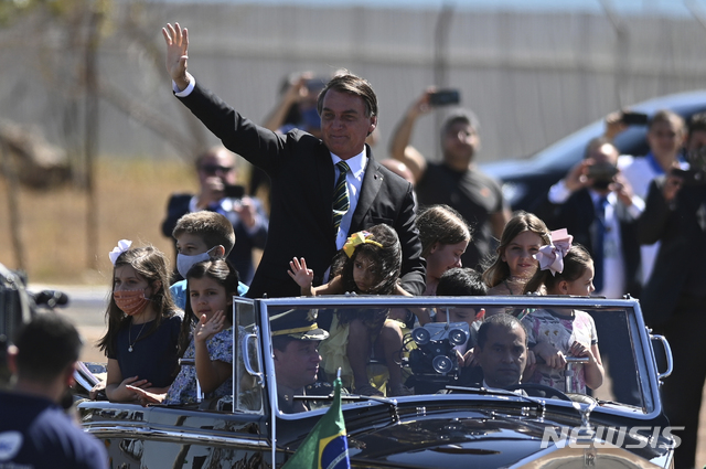 [브라질리아=AP/뉴시스]자이르 보우소나루 브라질 대통령이 7일(현지시간) 수도 브라질리아에서 열린 독립기념 행사에 참석해 아이들과 무개차에 올라 손을 흔들고 있다. 브라질은 1822년 9월 7일 포르투갈로부터 독립을 선언했다. 2020.09.07.