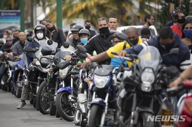 [카라카스=AP/뉴시스]베네수엘라에 휘발유 부족 사태가 이어지는 가운데 8일(현지시간) 수도 카라카스의 한 주유소에 코로나19 확산 예방을 위해 마스크를 쓴 오토바이 운전자들이 주유 순서를 기다리고 있다. 2020.09.09.