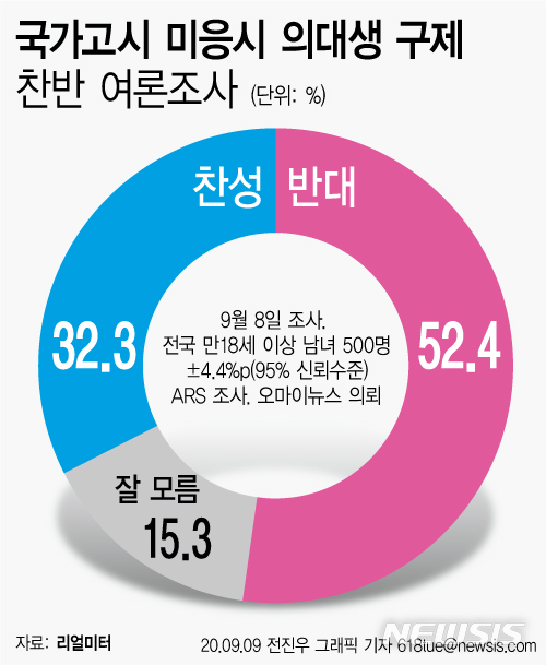[서울=뉴시스] 9일 여론조사 전문기관 리얼미터에 따르면 '오마이뉴스' 의뢰로 국시 미응시 의대생을 구제하는 데 대한 찬반을 조사한 결과, '반대' 응답이 52.4%로 다수였고, '찬성' 응답은 32.3%로 집계됐다. '잘 모름'은 15.3%였다. (그래픽=전진우 기자)