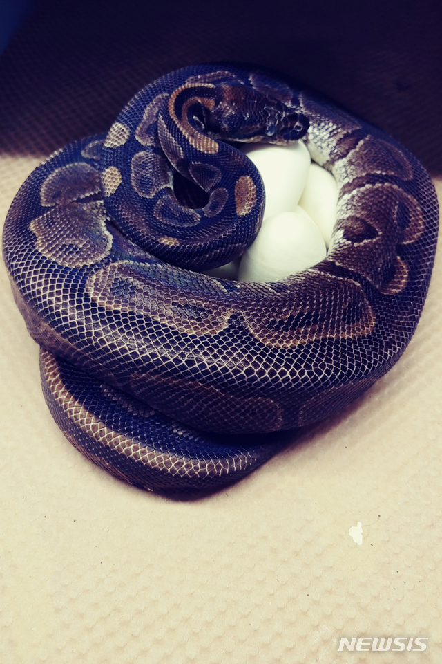 [세인트루이스=AP/뉴시스]미 미주리주 세인트루이스 동물원이 제공한 사진에 비단구렁이 한 마리가 지난 7월 23일 자신이 낳은 알을 품고 있다. 세인트루이스 동물원 전문가들은 62세의 이 구렁이가 지난 20년간 수컷 비단뱀 근처에 가지도 않았는데 어떻게 7개의 알을 낳았는지 알아내려 노력하고 있는 것으로 알려졌다. 2020.09.11.