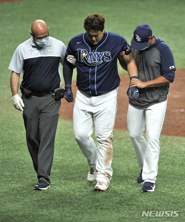 [세인트피터즈버그=AP/뉴시스]탬파베이 레이스 최지만(가운데)이 12일(현지시간) 미 플로리다주 세인트피터즈버그의 트로피카나필드에서 열린 2020 메이저리그(MLB) 보스턴 레드삭스와의 경기 중 4회 말 홈 쇄도 득점 과정에서 햄스트링 부상을 입어 부축받고 있다. 최지만은 5회 말 교체되기 전까지 1타수 1안타 1득점 1볼넷을 기록했고 탬파베이는 5-4로 승리했다. 2020.09.13.