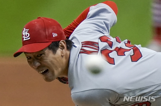 [밀워키=AP/뉴시스]세인트루이스 카디널스 김광현이 14일(현지시간) 미 위스콘신주 밀워키의 밀러 파크에서 열린 2020 메이저리그(MLB) 밀워키와의 연속경기 1차전 1회 투구하고 있다. 김광현은 6이닝 3피안타 6K 무실점으로 호투하면서 0-0으로 경기가 이어지고 있다. 2020.09.15.