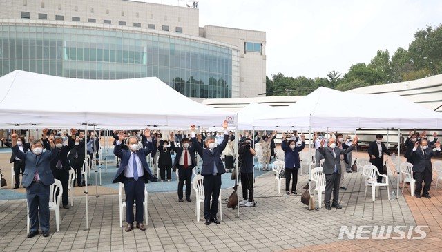 [서울=뉴시스]박삼득 국가보훈처장이 서울 용산구 전쟁기념관에서 열린 한국광복군 창군 제80주년 기념식에 참석해 김영관 한국광복군동지회장 및 주요내빈 및 애국지사들과 함께 만세삼창을 하고 있다. (사진=국가보훈처 제공) 2020.09.17.