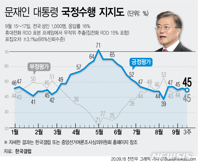 [서울=뉴시스]한국갤럽은 9월3주차 대통령 직무수행 평가 결과 응답자 가운데 45%가 '잘하고 있다'고 답했다고 18일 밝혔다. 전주 대비 1%포인트 하락한 수치다. (그래픽=전진우 기자)