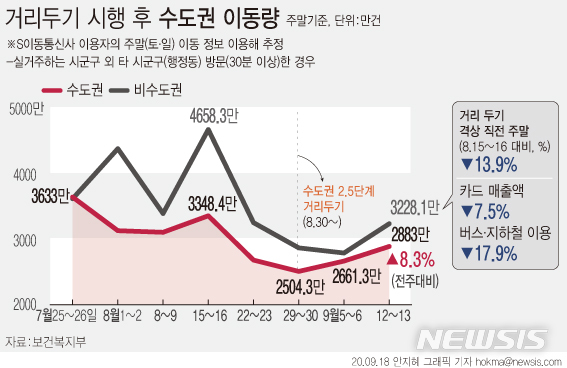 [서울=뉴시스]18일 보건복지부에 따르면 수도권 거리두기 2단계 격상 조치 후 네 번째로 맞이한 주말인 이달 12~13일 휴대전화 이동량은 그 직전 주말에 비해 8.3% 증가한 것으로 나타났다. (그래픽=안지혜 기자)
