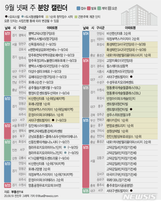 [서울=뉴시스] 19일 부동산 정보업체 부동산114에 따르면 9월 넷째 주에는 전국 12개 단지에서 총 1만1662가구(일반분양 7431가구)가 분양한다. (그래픽=전진우 기자)