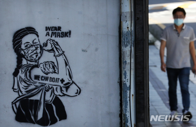 [인천=뉴시스] 이종철 기자 = 수도권을 중심으로 신종 코로나바이러스 감염증(코로나19)이 잇따르고 있는 가운데 18일 인천시 중구 한 도로변에 '마스크 착용'을 권하는 재미있는 벽화가 시민의 눈길을 끌고 있다. 2020.09.18.