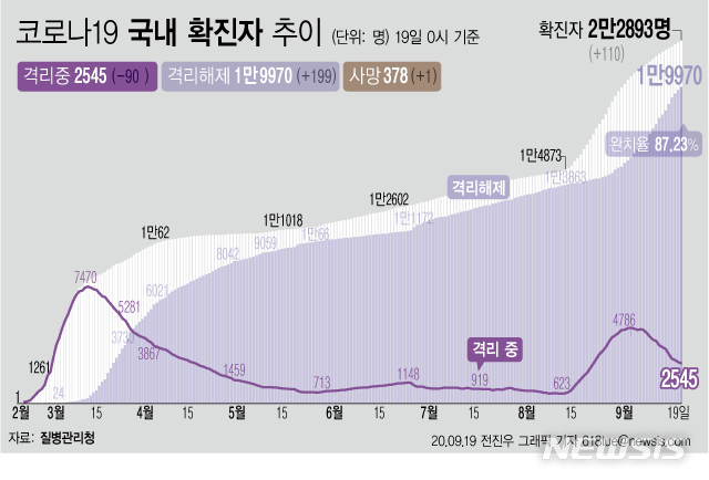 [서울=뉴시스]19일 0시 기준 '코로나 19' 누적 확진자는 110명 늘어난 2만2893명이다. 치료 중인 환자는 90명 줄어 2545명이 됐다. 확진자 중 완치자 비율을 나타내는 완치율은 87.23%를 기록하고 있다. (그래픽=전진우 기자)