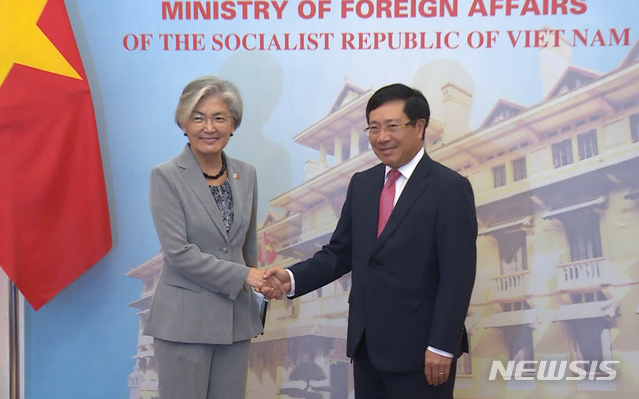 [서울=뉴시스] 조수정 기자 = 강경화 외교부 장관이 18일(현지시간) 베트남 하노이에서 팜 빙 밍 베트남 부총리 겸 외교장관과 회담에 앞서 악수하고 있다. (사진=외교부 제공) 2020.09.19.