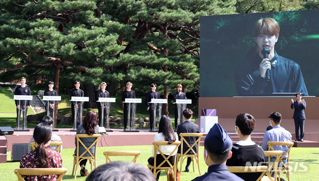 [서울=뉴시스]박영태 기자 = 19일 오전 청와대 녹지원에서 열린 제1회 청년의 날 기념식에서 방탄소년단(BTS)이 청년대표로 참석, 청년들을 향한 응원의 메시지를 보내고 있다. 2020.09.19.