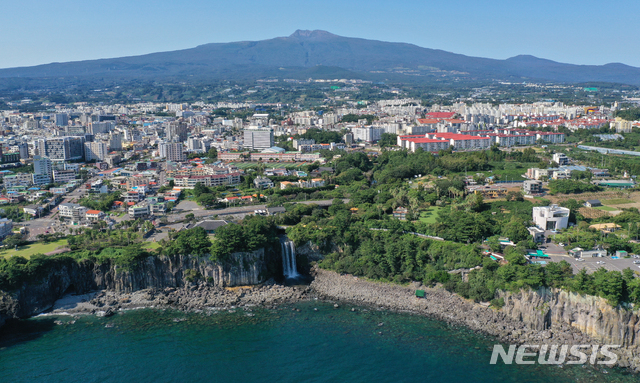 [서귀포=뉴시스]우장호 기자 = 완연한 가을 날씨를 보인 20일 오후 제주 서귀포시 정방폭포에 시원한 물줄기가 바다로 곧장 떨어지고 있다. 2020.09.20. [email protected]