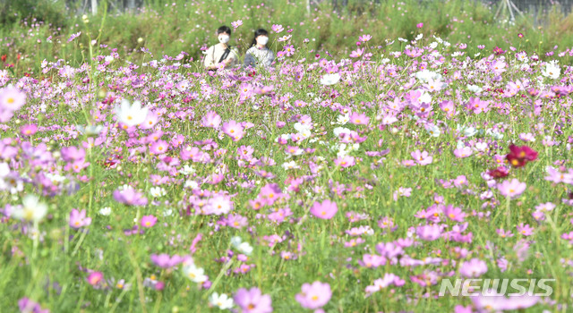 [경산=뉴시스] 이무열 기자 = 가을이 성큼 다가온 20일 오후 경북 경산시 하양읍 금호강변 코스모스 군락지에서 코스모스들이 활짝 피어 있다. 2020.09.20.