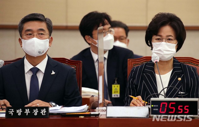 [서울=뉴시스]김진아 기자 = 추미애 법무부 장관이 21일 서울 여의도 국회에서 열린 법제사법위원회 전체회의에 출석해 의원 질의에 답변하고 있다. 왼쪽은 서욱 국방부장관. (공동취재사진) 2020.09.21.