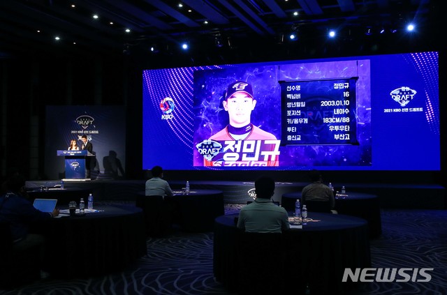 [서울=뉴시스]21일 오후 서울 중구 웨스틴조선호텔 그랜드볼룸에서 열린 2021 KBO 신인 드래프트에서 한화이글스가 정민규(부산고)를 1차 지명하고 있다. 이번 신인 드래프트는 사회적 거리두기 방침에 따라 행사장과 각 구단 회의실을 화상 연결하는 언택트 방식으로 진행됐다. (사진=KBO 제공) 2020.09.21.