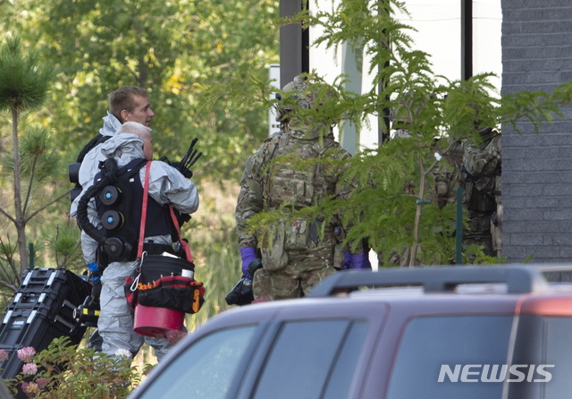 [생위베르=AP/뉴시스]21일(현지시간) 캐나다 퀘벡주 생 위베르의 한 아파트 단지에서 캐나다 왕립 경찰이 미국 백악관으로 발송된 독극물 우편물과 관련해 용의자 현장 조사를 벌이고 있다. 앞서 도널드 트럼프 미국 대통령 앞으로 독극물 '리친'이 든 소포가 발송돼 추적 끝에 여성 용의자가 체포됐었다. 리친은 0.001g 정도의 극소량으로도 사람을 죽음에 이르게 할 수 있는 독극물로 알려져 있다. 2020.09.22.