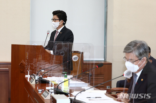 [서울=뉴시스] 김진아 기자 = 조명래 환경부 장관이 22일 오전 서울 여의도 국회에서 열린 환경노동위원회 전체회의에서 제안설명을 하고 있다. (공동취재사진) 2020.09.22. [email protected]