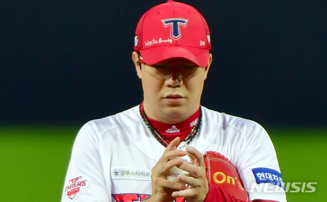 [광주=뉴시스] 류형근 기자 = 22일 오후 광주 북구 광주-기아챔피언스필드에서 열린 2020프로야구 KIA 타이거즈 대 키움 히어로즈의 경기, KIA 선발투수 양현종이 모자에 동료 브룩스의 이름을 새기고 출전하고 있다. 브룩스는 이날 아내와 자녀 등 가족들이 교통사고를 당해 미국으로 급히 출국했다. 2020.09.22.