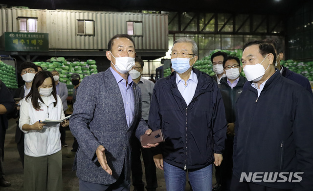 [서울=뉴시스] 박미소 기자 = 김종인 국민의힘 비상대책위원장이 22일 서울 송파구 가락시장 청과시장 배추 경매 현장을 참관하고 있다. 2020.09.22.
