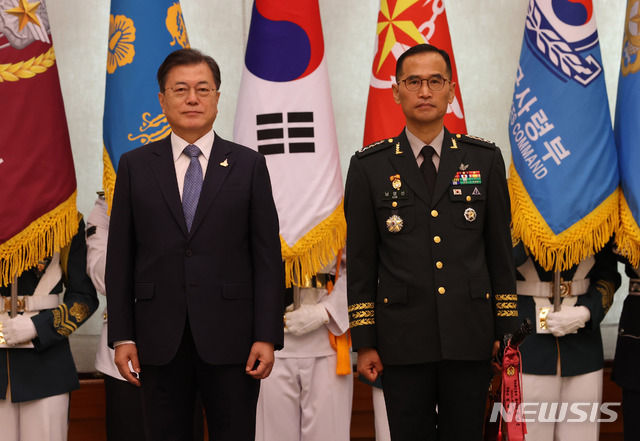 [서울=뉴시스]추상철 기자 = 문재인 대통령이 23일 오전 청와대에서 남영신 육군참모총장의 보직신고를 받은 후 삼정검(三精劍)에 수치(綬幟)를 달아준후 기념촬영을 하고 있다. 수치는 끈으로 된 깃발로 장성의 보직과 이름, 임명 날짜, 수여 당시 대통령 이름이 수놓아져 있다. 2020.9.23.