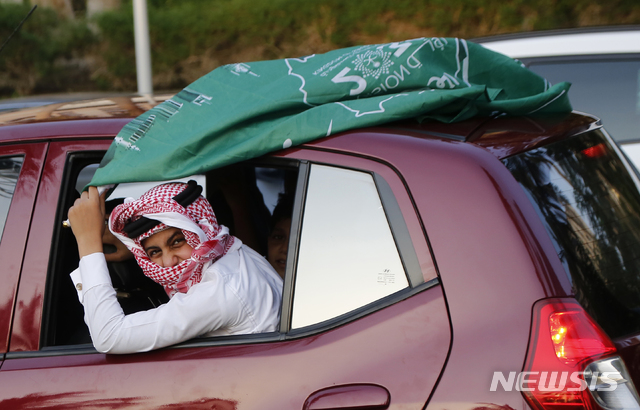 [지다=AP/뉴시스]23일(현지시간) 사우디아라비아 지다에서 사우디아라비아 왕국 통합을 기념해 자동차 탑승 여성이 사우디 국기를 흔들고 있다. 사우디는 1927년 영국으로부터 독립해 1932년 9월 23일 사우디아라비아왕국으로 통합됐다. 2020.09.24.