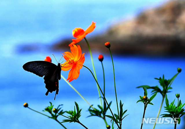 【남해=뉴시스】차용현 기자 = 완연한 가을 날씨가 이어지고 있는 24일 오후 경남 남해군 남면의 한 바닷가에서 제비나비 한 마리가 활짝 꽃망울을 터뜨린 황화코스모스에 앉아 꿀을 따고 있다. 2020.09.24.
