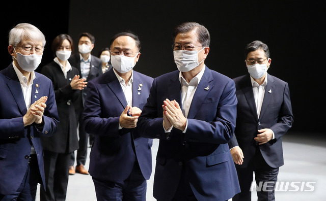 [김포=뉴시스]추상철 기자 = 문재인 대통령이 24일 오후 경기 김포시 민간 온라인 공연장인 캠프원에서 열린 디지털뉴딜문화콘텐츠산업 전략보고회를 마치고 이동하고 있다. 왼쪽부터 최기영 과학기술정보통신부 장관, 홍남기 경제부총리 겸 기획재정부 장관, 문재인 대통령, 박양우 문화체육관광부 장관. 2020.9.24.