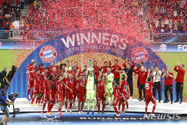[부다페스트=AP/뉴시스]바이에른 뮌헨(독일)의 골키퍼 마누엘 노이어가 24일(현지시간) 헝가리 부다페스트의 푸스카스 아레나에서 유관중으로 열린 2020년 UEFA 슈퍼컵 경기에서 세비야(스페인)를 꺾고 우승해 슈퍼컵을 들어 올리며 동료들과 함께 기뻐하고 있다. 챔스리그 우승팀 뮌헨은 유로파리그 우승팀 세비야를 연장 끝에 2-1 역전승을 거두고 7년 만에 슈퍼컵 우승을 차지했다. 2020.09.25.