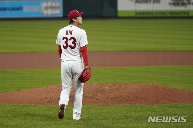 [세인트루이스=AP/뉴시스]세인트루이스 카디널스의 김광현이 24일(현지시간) 미 미주리주 세인트루이스 부시스타디움에서 열린 2020 메이저리그(MLB) 밀워키 브루어스와의 홈경기에 선발 등판해 4회 1실점 한 후 아쉬워하고 있다. 김광현은 5회 초 5피안타 3K 1실점으로 투구하고 있으며 세인트루이스는 3-1로 앞서가고 있다. 2020.09.25.