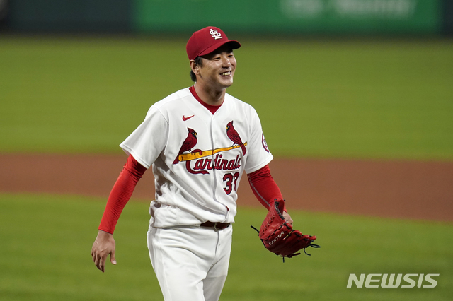 [세인트루이스=AP/뉴시스]세인트루이스 카디널스의 김광현이 24일(현지시간) 미 미주리주 세인트루이스 부시스타디움에서 열린 2020 메이저리그(MLB) 밀워키 브루어스와의 홈경기에 선발 등판해 5회 말 위기를 넘기고 마운드를 내려오고 있다. 김광현은 5이닝 5피안타 3K 1실점을 기록했고 세인트루이스는 7회 말 4-1로 앞서있다. 2020.09.25