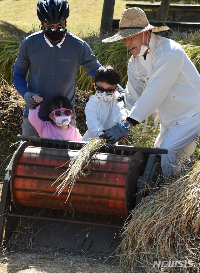 [수원=뉴시스] 김종택기자 = 맑고 청명한 가을 날씨를 보인 27일 경기 수원시 권선구 고색동 향토문화전시관에서 열린 '도심속 전통농사체험 행사'에서 어린이들이 전통탈곡기를 이용한 탈곡체험을 하고 있다. 2020.09.27.