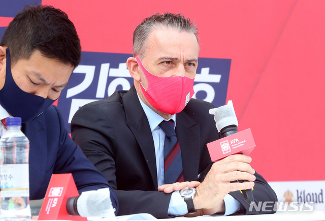 [고양=뉴시스]배훈식 기자 = 파울루 벤투 축구 국가대표팀 감독이 28일 오후 경기 고양시 고양종합운동장에서 열린 대표팀 명단 발표 기자회견에 참석해 취재진의 질문에 답변하고 있다. 2020.09.28.