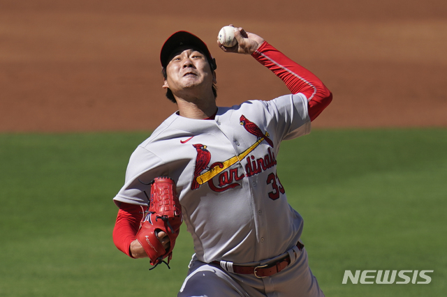 [샌디에이고=AP/뉴시스]세인트루이스 카디널스 김광현이 30일(현지시간) 미 캘리포니아주 샌디에이고의 펫코파크에서 열린 내셔널리그 와일드카드 시리즈(3전 2선승제) 샌디에이고 파드리스와의 1차전에 선발 등판해 1회 투구하고 있다. 김광현은 3⅔이닝 5피안타 2K 2볼넷 3실점하고 팀이 6-3으로 앞선 상황에서 교체됐다. 2020.10.01.