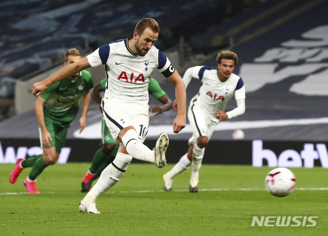 [런던=AP/뉴시스]토트넘의 해리 케인이 1일(현지시간) 영국 런던의 토트넘 홋스퍼 스타디움에서 열린 유럽축구연맹(UEFA) 유로파리그 플레이오프 마카비 하이파(이스라엘)와의 경기에 선발 출전해 후반 11분 PK를 넣고 있다. 케인의 해트트릭 원맨쇼를 앞세운 토트넘은 마카비 하이파를 7-2로 꺾고 유로파리그 본선에 진출했다. 2020.10.02.