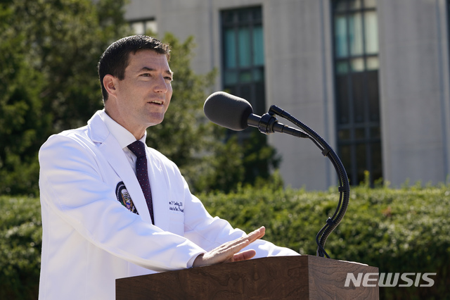 [베세즈다=AP/뉴시스] 3일(현지시간) 미국 메릴랜드주 베세즈다에 있는 월터 리드 군병원에서 숀 콘리 대통령 주치의는 기자회견을 하고 있다. 그는 "오늘 아침 도널드 트럼트 대통령의 상황은 매우 좋다"고 밝혔다. 신종 코로나바이러스 감염증(코로나19)에 걸린 트럼프 대통령은 이 병원에서 치료를 받고 있다. 2020.10.04