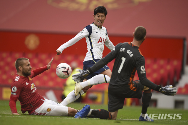 [맨체스터=AP/뉴시스]토트넘 손흥민(가운데)이 4일(현지시간) 영국 맨체스터의 올드 트래퍼드에서 열린 2020-21시즌 프리미어리그(EPL) 4라운드 맨체스터 유나이티드와의 경기에 선발 출전해 1-1 상황이던 전반 7분 팀의 두 번째 골을 넣고 있다. 맨유 상대 첫 골을 넣은 손흥민은 2골 1도움을 기록하며  후반 27분 벤 데이비스와 교체됐다. 토트넘은 손흥민과 케인의 멀티골 등을 묶어 6-1로 승리했다. 2020.10.05.